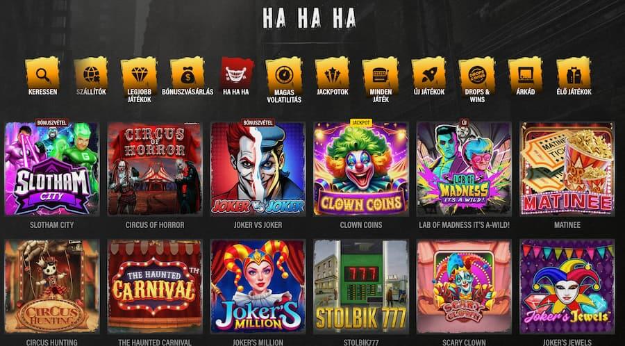 A honlapon kategóriánként böngészheted a játékkínálatot, amelyben olyan különleges menüvel is találkozhatsz, mint a “Ha Ha Ha”, ahol Joker és cirkuszi bohóc tematikájú slotokat pörgethetsz.